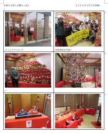 桃の節句の雛祭りの日ではありましたが、生憎の空模様の中氏家駅周辺に50ヵ所以上に展示されている雛飾りを鑑賞する氏家雛巡りを実施しました。今回は15名の参加でした。雛めぐりは氏家町が催しを初めて今年で23回目になりますが、見ごたえのある各展示に天候も気にならず楽しいしひと時を過ごしました。見学の後は近くのレストランなどでお昼を食べて散会となりました。