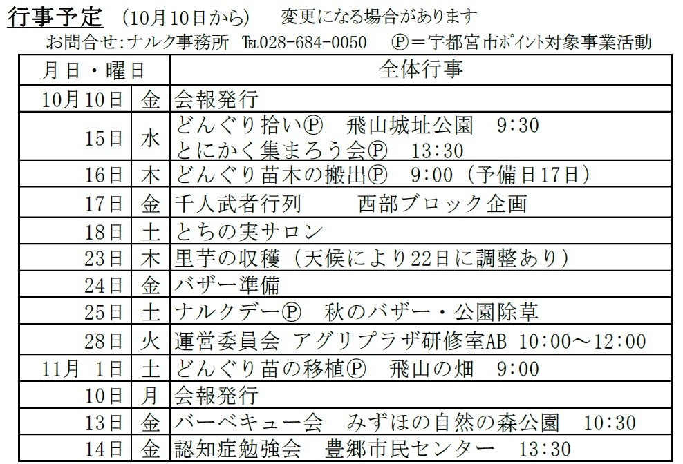 ![]() 10月の予定が決まりました。 積極的な利用をお願いします。 ご希望の方は事務所又は運営委員に連絡下さい。 |