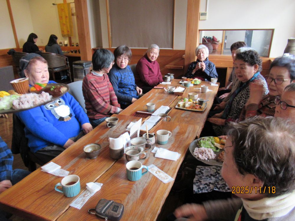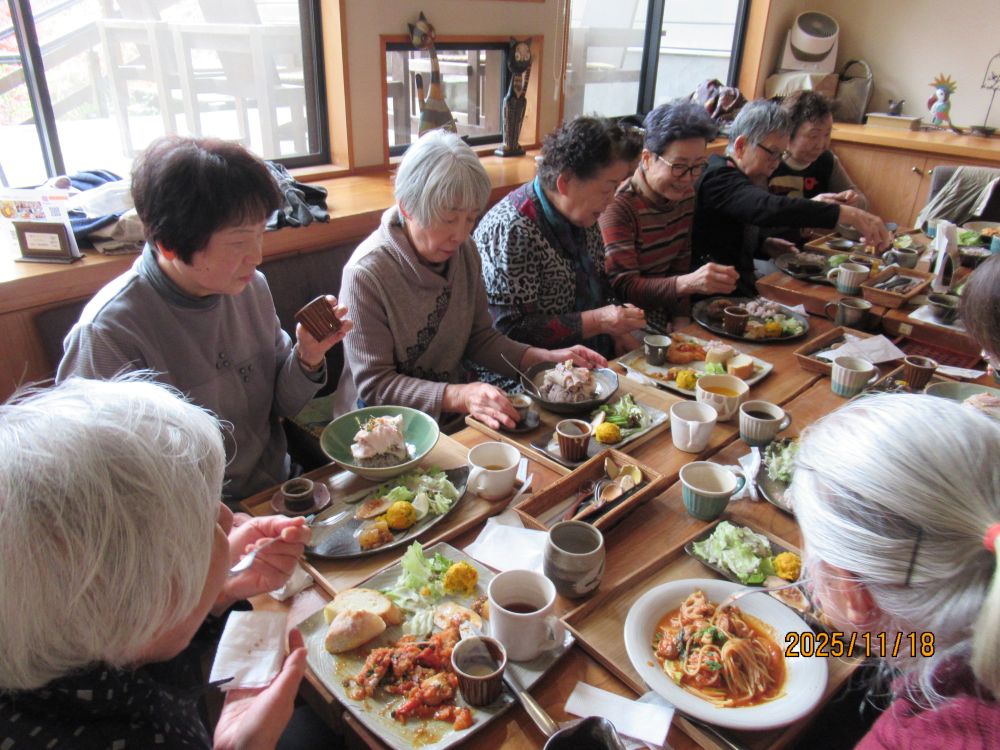11月18日(火)12名が参加し、10時半に集合して益子にある森のレストランへ行き皆で食事をしました。 パスタやカレーなど皆思い思いのメニューを楽しみ、話しも弾む和気あいあいとした時間を過ごしました。 その後道の駅ましこに足を延ばし買物をしたあと帰路につきました。宇都宮へは15時位に到着し解散となりました。 紅葉も見ごろで、のんびり一日を仲間と共に過ごし満足なひと時でした。